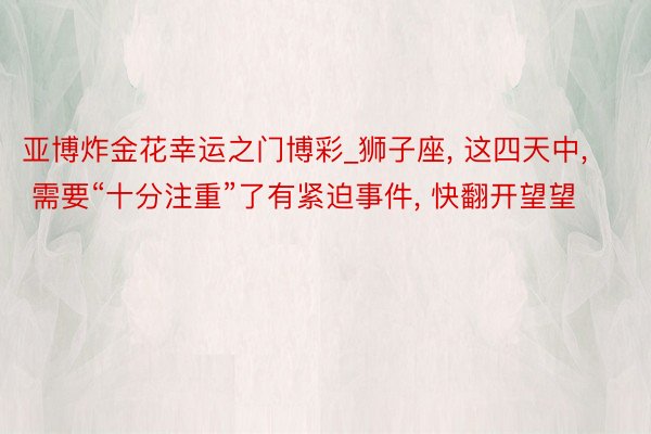 诸君狮子座的亲们,听我一言,接下来的四天里,你们可得“十分注重”了!因为在这寥落的日子里,你们可能会碰到一些出东说念主猜测的大事哦!飞速来沿途瞧瞧,让我方作念好防守准备吧!到时代可别说我没辅导到位哈!